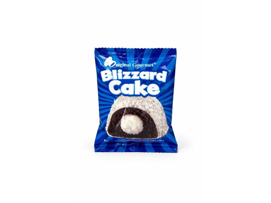 Blizzard Cake je nadýchaný kakaový dortík plněný jemným krémem, potažený bílou polevou a posypaný kokosovými hoblinkami. Kombinuje vláčné těsto, sladkou náplň a lehce exotickou kokosovou chuť v praktickém balení.