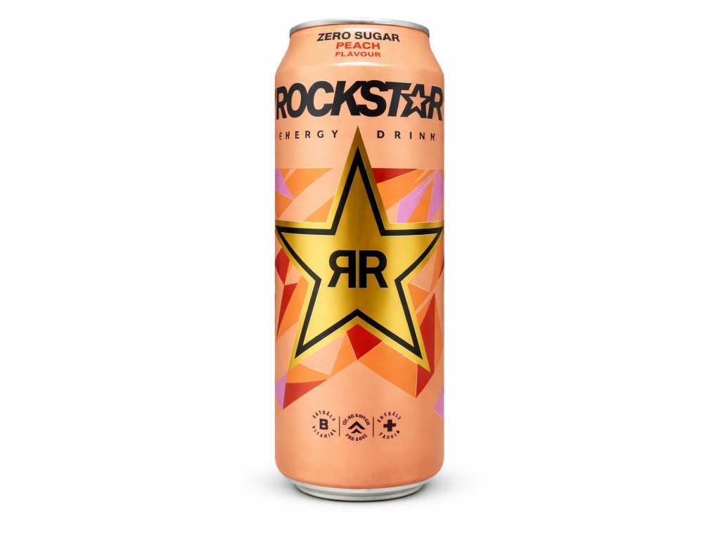 Sycený energetický nápoj s broskvovou příchutí, se sladidly.