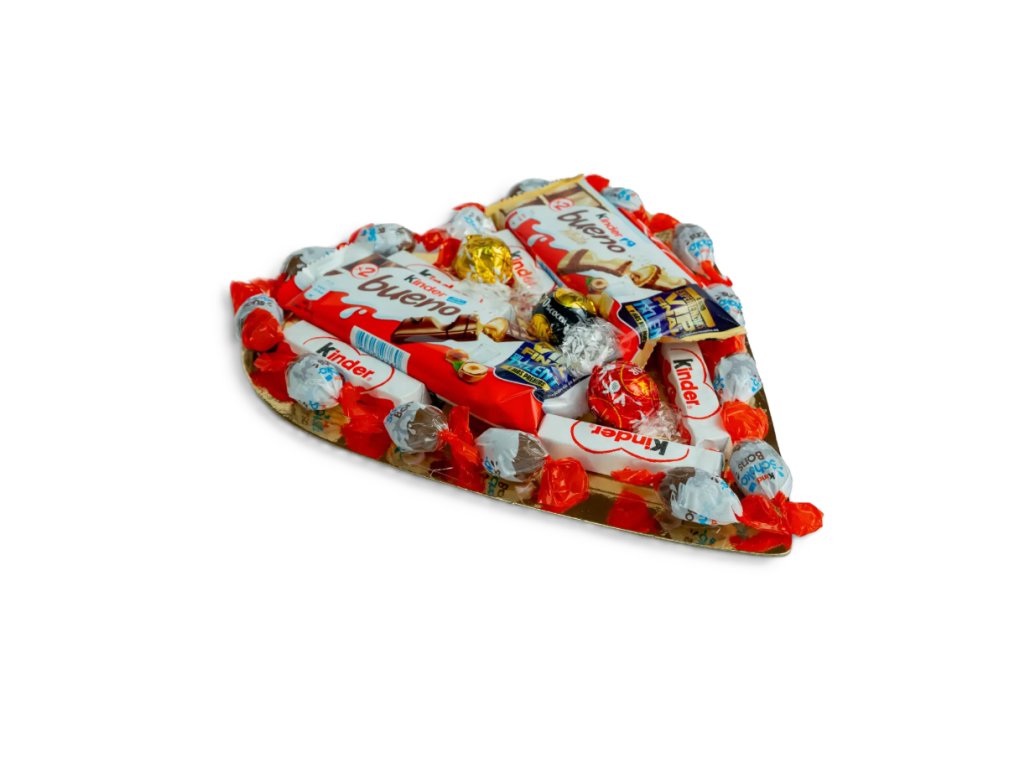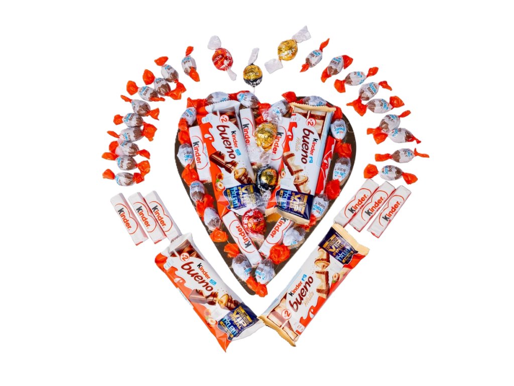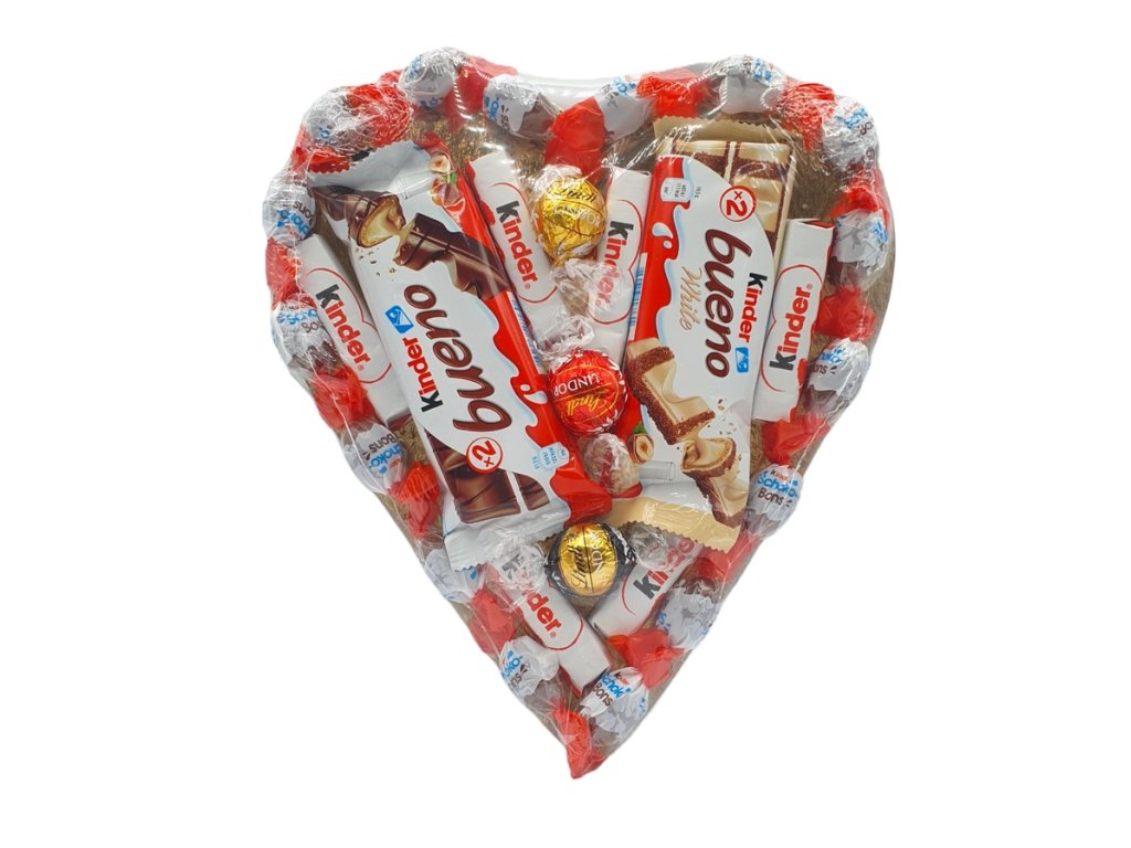 Srdce je vyskládané z oblíbených Kinder Schoko-Bons, doplněné čokoládami Kinder Bueno, Kinder Chocolate a prémiovými pralinkami Lindt. Kombinace značek, které má rád skoro každý, z něj dělá ideální dárek k Valentýnu, výročí nebo jako sladké poděkování.